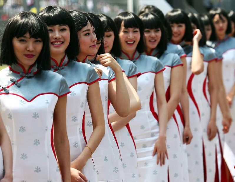 2013年4月14日,2013年F1中国大奖赛正赛,旗袍礼仪美女演绎东方风韵。