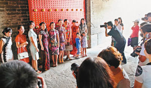 年轻妈妈们穿着颜色、款式各异的旗袍,在城墙上摆起了各种pose。旗袍秀不仅展现了年轻妈妈们的东方美,也将旗袍简约、典雅的气质表现得淋漓尽致。十几位来自波兰的游客情不自禁地停下脚步,和年轻妈妈们合影留念,并不住地赞叹:“很漂亮。”小伙Mike告诉记者,他是第一次来中国,第一次见到旗袍,真的太漂亮了。图为旗袍秀吸引了众多摄影爱好者拍照。